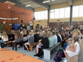 Gestern wurden im Rahmen einer feierlichen Veranstaltung am Nachmittag 123 neue Fünftklässler/innen an der OBS Uplengen "eingeschult". Zusammen mit ihren Eltern, Großeltern und anderen Verwandten fanden sich die Fünftklässler/innen in der Sporthalle ein, um dieses besondere Ereignis gemeinsam zu feiern. In einer ersten Unterrichtsstunde konnten die Kinder ihre neuen Klassenlehrkräfte Hannah Lammers, Julia Bensel-Klink, Janina Schreiber, Ida Reins, Rieka Gerke-Löcherbach und Thilo Baumann kennenlernen. Als kleine Überraschung gab es kreativ gestaltete Knallbonbons mit einer schönen Überraschung, die die Kinder aus dem 6. Jahrgang vorbereitet hatten. Eine größere Überraschung wartete auf dem Schulhof: Beim angemieteten Eiswagen durften sich alle Fünftklässler/innen zum Abschluss zwei Kugeln Eis aussuchen. Wir freuen uns auf die Zeit mit den neuen Fünftklässler/innen und wünschen viel Freude und Erfolg für die Zeit an unserer Schule!
