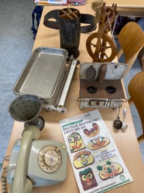 Dass sich Geschichte nicht nur in Büchern befindet, sondern auch in Dingen, die direkt aus dem Alltag stammen, haben heute die SchülerInnen des 5. Jahrganga durch das MItbringen einer Quelle bewiesen. So konnten unter anderem alte Wärmflaschen, Münzen und Geldscheine, Fotos, ein Telefon, ein Spinnrad oder ein Fensterhobel bestaunt werden.