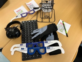 Wie fühlt sich das Altern an? Die SchülerInnen des Profilkurses Gesundheit und Soziales in Jahrgang 10 haben es selbst ausprobiert. Durch spezielle Brillen, Handschuhe, Manschetten und Kopfhörer wurde die eingeschränkte Wahrnehmung sowie Gelenksteifigkeit im Alter simuliert und eine Runde Bingo unter diesen erschwerten Bedingungen gespielt. Eine tolle Möglichkeit, Empathie und Verständnis für altere Menschen zu fördern und zu stärken.